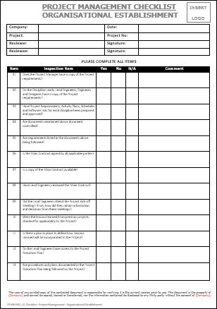 The Project Management Organisational Establishment Checklist provides a mechanism for personnel such as Project Directors, JV Partners and Client Representatives involved in a significant project to evaluate and ensure key engineering, cost control, contractual, resourcing and general project requirements are identified, developed, established, communicated and implemented prior to the commencement of the project.