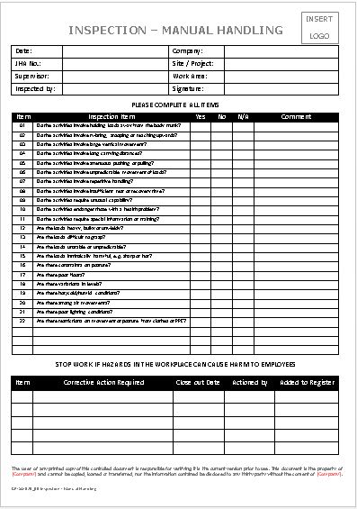 The Manual Handling Inspection provides a mechanism for Safety Professionals, Supervisors and Managers to conduct targeted manual handling inspections. Inspection criteria includes but is not limited to worker capabilities, load dimensioning, activity location, environmental conditions and training.