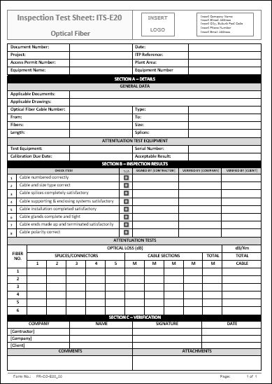 The Optical Fiber Inspection Test Sheet provides a mechanism to document the specifications, criteria and equipment used in conducting Optical Fiber Testing.