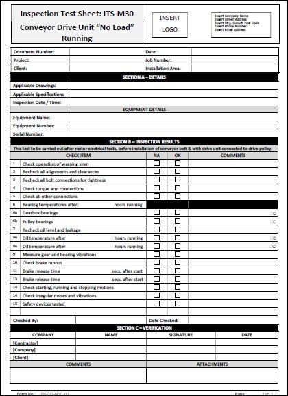 The Conveyor Drive Unit No Load Running Inspection Test Sheet provides a mechanism to outline the criteria and predetermined activities that must be completed, prior to hand over for commissioning and acceptance.