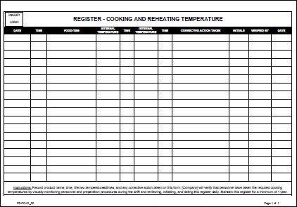 The Cooking and Reheating Temperature Register is a tool to record product name, time, the two temperatures/times, and any corrective action taken on this form. Company will verify that personnel have taken the required cooking temperatures by visually monitoring personnel and preparation procedures during the shift and reviewing, initialling, and dating this register daily.
