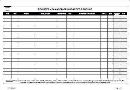 The Damaged or Discarded Product Register is a tool to record product name, quantity, action taken, reason, initials, and date each time a food or food product is damaged and/or will be discarded. Company will verify that employees are discarding damaged food properly by visually monitoring employees during the shift and reviewing, initialling, and dating this register daily.