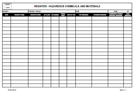 The Hazardous Chemical and Materials Register provides a mechanism to document all critical requirements of hazardous chemicals and material in the workplace, including storage, transport, disposal and PPE.
