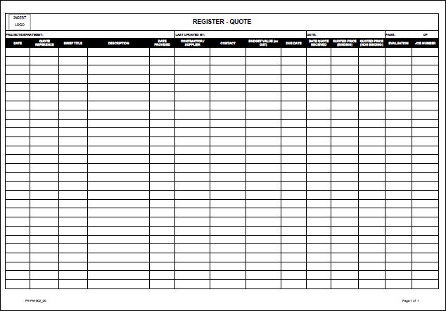 The Quote Register template provides Company personnel including Directors, Project Managers, Procurement Managers and Contract Managers to review and manage quotes received by Contractors and Suppliers for various contracts, projects, supplies or materials raised during the course of a contract, project or general business.