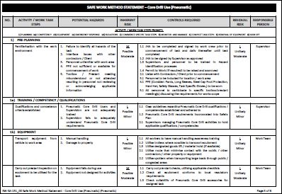 This Safe Work Method Statements provides a basic outline of activity, potential hazards and recommended controls with provision to include activity specific requirements and personnel who are responsible for the review, approval and monitoring aspects of the activity.