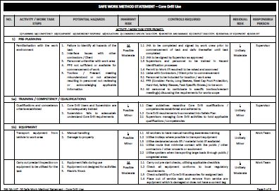 This Safe Work Method Statements provides a basic outline of activity, potential hazards and recommended controls with provision to include activity specific requirements and personnel who are responsible for the review, approval and monitoring aspects of the activity.