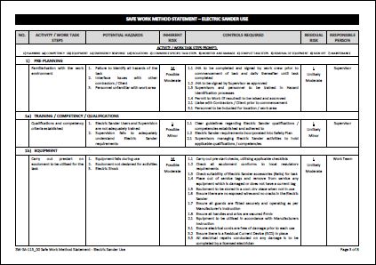 This Safe Work Method Statement outlines the general requirements to undertake Electric Sander activities in a safe and structured manner.