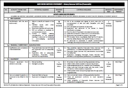 This Safe Work Method Statements provides a basic outline of activity, potential hazards and recommended controls with provision to include activity specific requirements and personnel who are responsible for the review, approval and monitoring aspects of the activity.