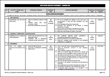 This Safe Work Method Statements provides a basic outline of activity, potential hazards and recommended controls with provision to include activity specific requirements and personnel who are responsible for the review, approval and monitoring aspects of the activity.
