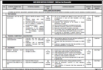 This Safe Work Method Statements provides a basic outline of activity, potential hazards and recommended controls with provision to include activity specific requirements and personnel who are responsible for the review, approval and monitoring aspects of the activity.