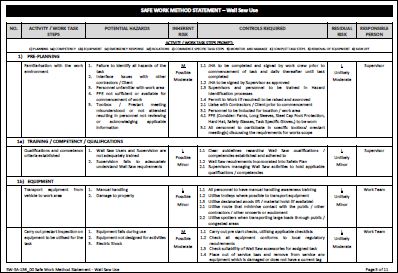 This Safe Work Method Statements provides a basic outline of activity, potential hazards and recommended controls with provision to include activity specific requirements and personnel who are responsible for the review, approval and monitoring aspects of the activity.