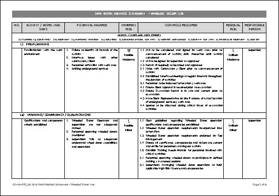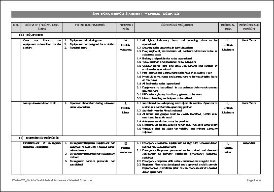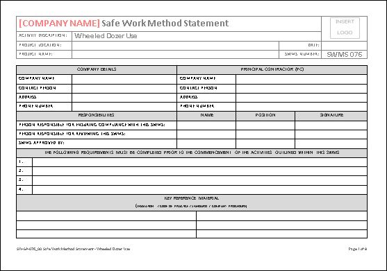 This Safe Work Method Statements provides a basic outline of activity, potential hazards and recommended controls with provision to include activity specific requirements and personnel who are responsible for the review, approval and monitoring aspects of the activity.