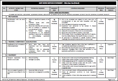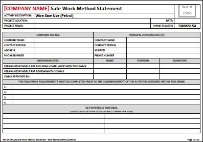 This Safe Work Method Statements provides a basic outline of activity, potential hazards and recommended controls with provision to include activity specific requirements and personnel who are responsible for the review, approval and monitoring aspects of the activity.