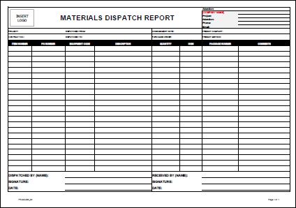 The Materials Dispatch Report Template provides a mechanism to record the quantity and type of material, items and products transferred from one location to another. Key fields include description, quantity, reference, transport method and acknowledgement of receipt.