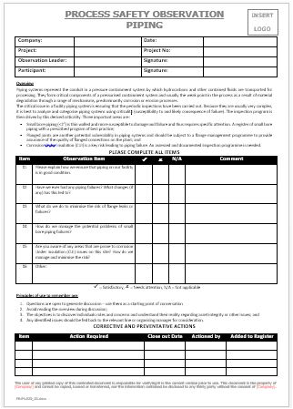 The Piping Process Safety Observation Form provides a mechanism for personnel such as Operational Managers, Specialists and Technical Personnel to interact and evaluate front line personnel’s knowledge of implemented process safety piping related systems, procedures and activities.
