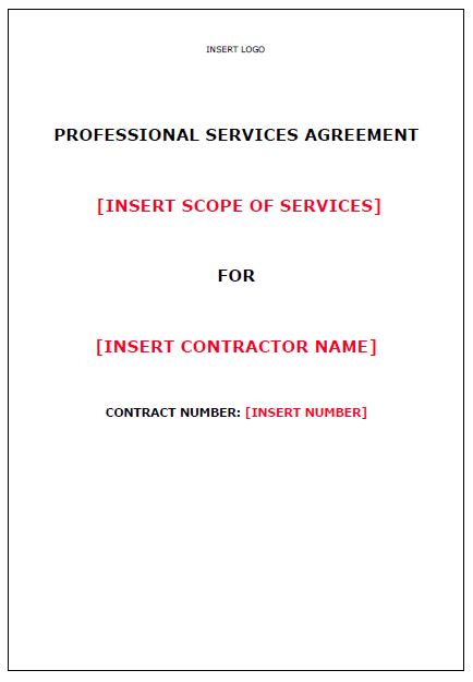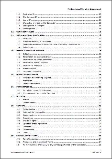 The Professional Services Agreement provides a mechanism to engage contractors and consultants to conduct activities upon agreed terms and condition. The template includes the following sections, which should all be reviewed and aligned to individual company business practices prior to engagement: