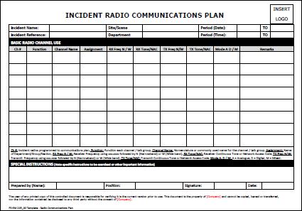 The Radio Communication Plan Template provides information on radio frequencies or trunked radio system talk groups for each operational period. The Template is a summary of information obtained about available radio frequencies, talkgroup and assignments for use by incident responders.